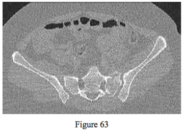 Figure 63 is the CT scan of a 43-year-old woman who was involved in a motor vehicle collision and sustained multiple injuries including a pelvic fracture. The injury shown in the CT scan is most consistent with a (an)