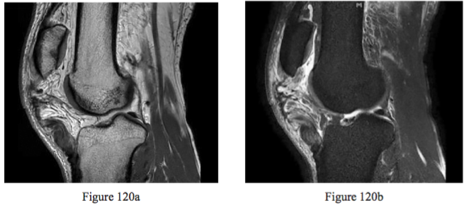 Figures 120a and 120b are the sagittal MR images of a man who injured his knee after he slipped and fell