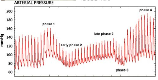 This figure shows arterial blood pressure during Valsalva maneuver. What is the most likely cause of the arterial pressure increase in late phase 2?