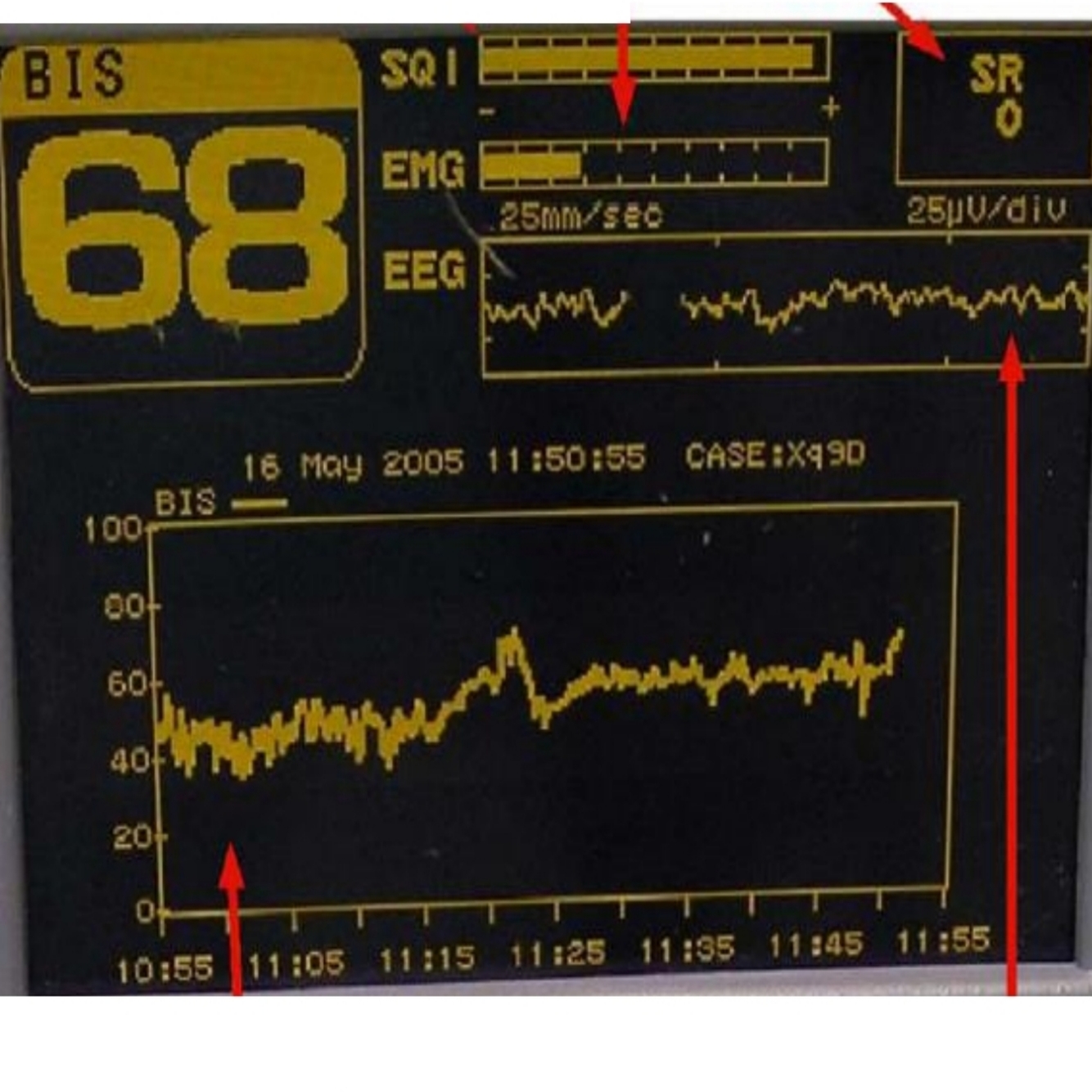This is a picture of the screen of a Bispectral index (BIS) monitor