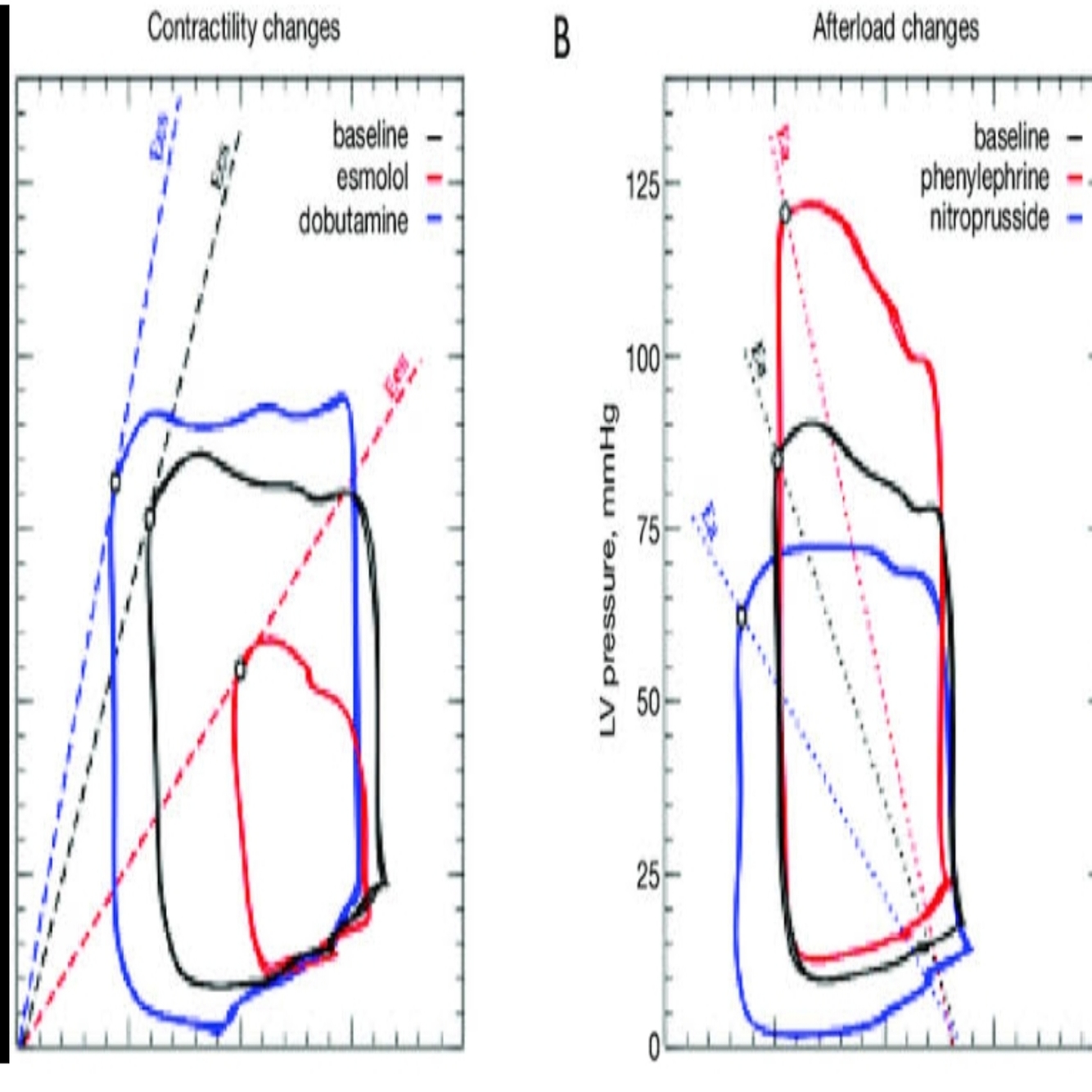 Left ventricular pressure-volume (PV) loops showing the effects of contractility changes on Ees and afterload variations in Ea. (A) Cardiac contractility was increased with dobutamine and decreased with esmolol. The slope of the end-systolic PV relation (ESPVR) defines the end-systolic elastance (Ees, dashed colored lines) and the contractility performance at each stage. (B) Afterload was increased with phenylephrine and decreased with sodium nitroprusside. The lines connecting the end-diastolic volume and end-systolic pressure describes the effective arterial elastance at each stage (Ea, dotted colored lines).