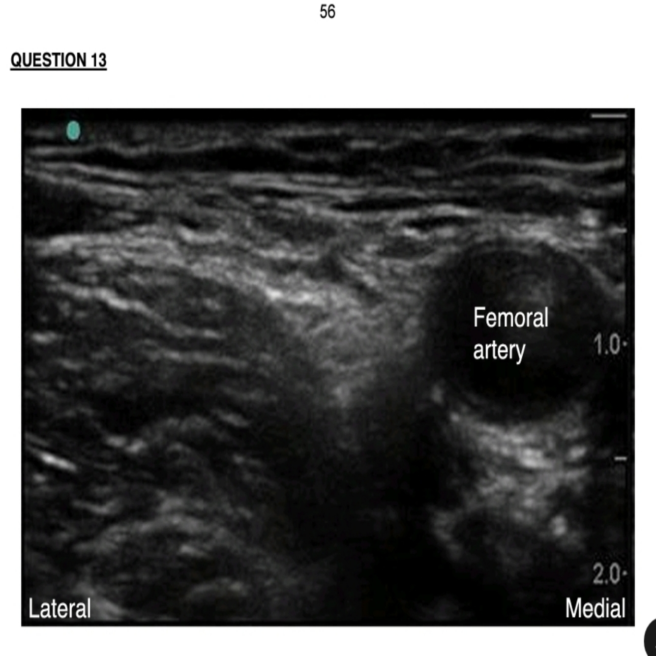 a) Above is an ultrasound image in the transverse plane just caudal to the inguinal ligament showing normal anatomy. Draw a diagram of this image indicating the important venous, neural and fascial structures.