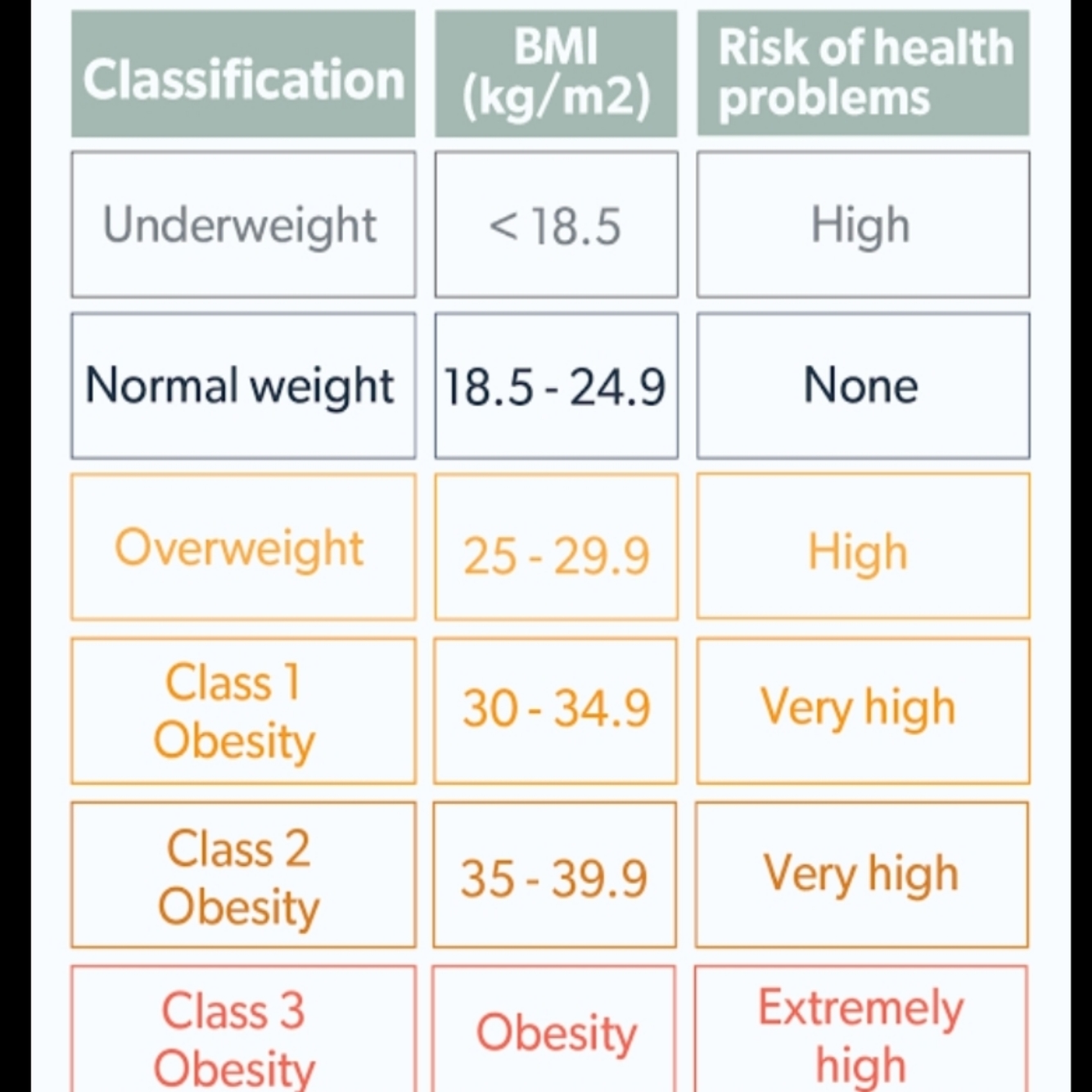a) Calculate BMI and categorise this patient according to the standard WHO BMI classification table.