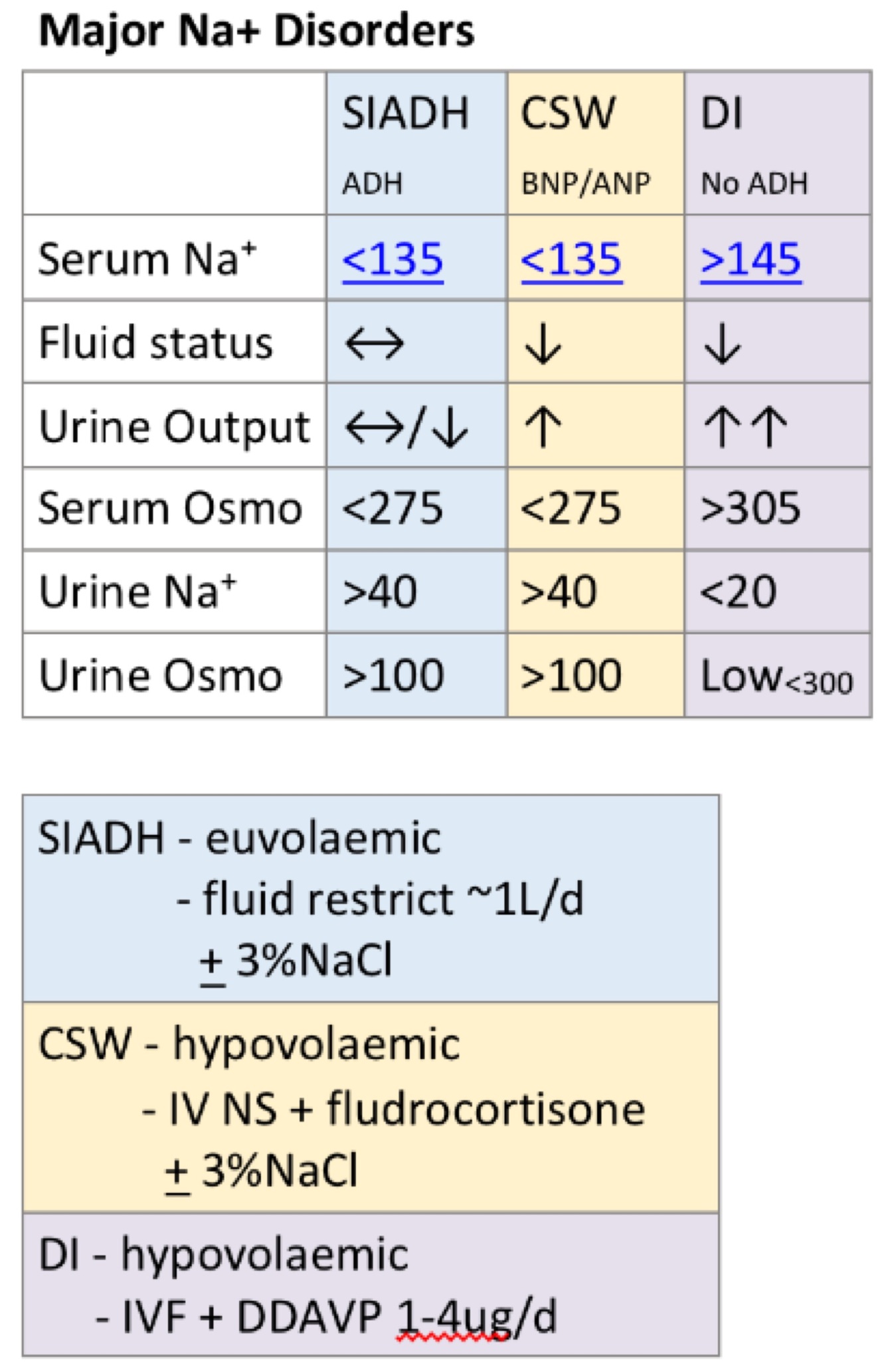 d. Urine osmolarity <100 DIAGNOSTIC CRITERIA >hypotonic hyponatraemia >urine osmolality > plasma osmolality (<275mOsm/kg) (i.e. concentrated urine despite hypotonic blood) >urinary Na+ > 20mmol/L >normal renal, hepatic, cardiac, pituitary, adrenal and thyroid function >euvolaemia (absence of hypotension, hypovolaemia, and oedema) correction by water restriction CAUSES (MAD CHOP) Major Surgery >abdominal >thoracic >transsphenoidal pituitary surgery (6-7 days post op) ADH production by tumours (Ectopic) >small cell bronchogenic carcinoma >adenocarcinoma of pancreas/duodenum >leukaemia >lymphoma >thymoma Drugs >antidepressants (e.g. SSRI, TCAs, MAOIs) >psychotropics (e.g. haloperidol, chlorpromazine), carbamazepine, Na+ valproate) >anaesthetic drugs (barbiturates, inhalational agents, oxytocin, opioids) >ADH analogues (vasopressin, DDAVP) >chemotherapy (e.g.Vinca alkaloids, Melphalan, Methotrexate and cyclophosphamide) >others (e.g. NSAIDs, amiodarone, ciprofloxacin, morphine, MDMA, proton pump inhibitors) CNS Disorders >cerebral trauma >brain tumour (primary or metastases) >meningitis/encephalitis >brain abscess >SAH >acute intermittent porphyria >SLE Hormone deficiency >hypothyroidism >adrenal insufficiency Others >Guillain-Barre Syndrome >HIV infection (early symptomatic or AIDS) >hereditary SIADH >giant cell arteritis >idiopathic (occult small cell or olfactory neuroblastoma) Pulmonary Disorders >pneumonia (viral, fungal, bacterial) >TB >lung abscess MANAGEMENT 1. see hyponatraemia 2. fluid restrict 3. incremental increase in Na+ if indicated to avoid central pontine myelinolysis 4. medications to decrease ADH secretion >Demeclocycline >Tolvaptan / Conivaptan