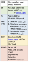 Labetalol 1. Labetalol: 20-40mg IV q10min 2. Nifedipine 10-20mg PO Q45min 3. Hydralazine 5-10mg IV q20min RANZCOG first line drugs are > methyldopa > labetalol > oxprenolol. Second line agents are: - hydralazine - nifedipine - prazosin.