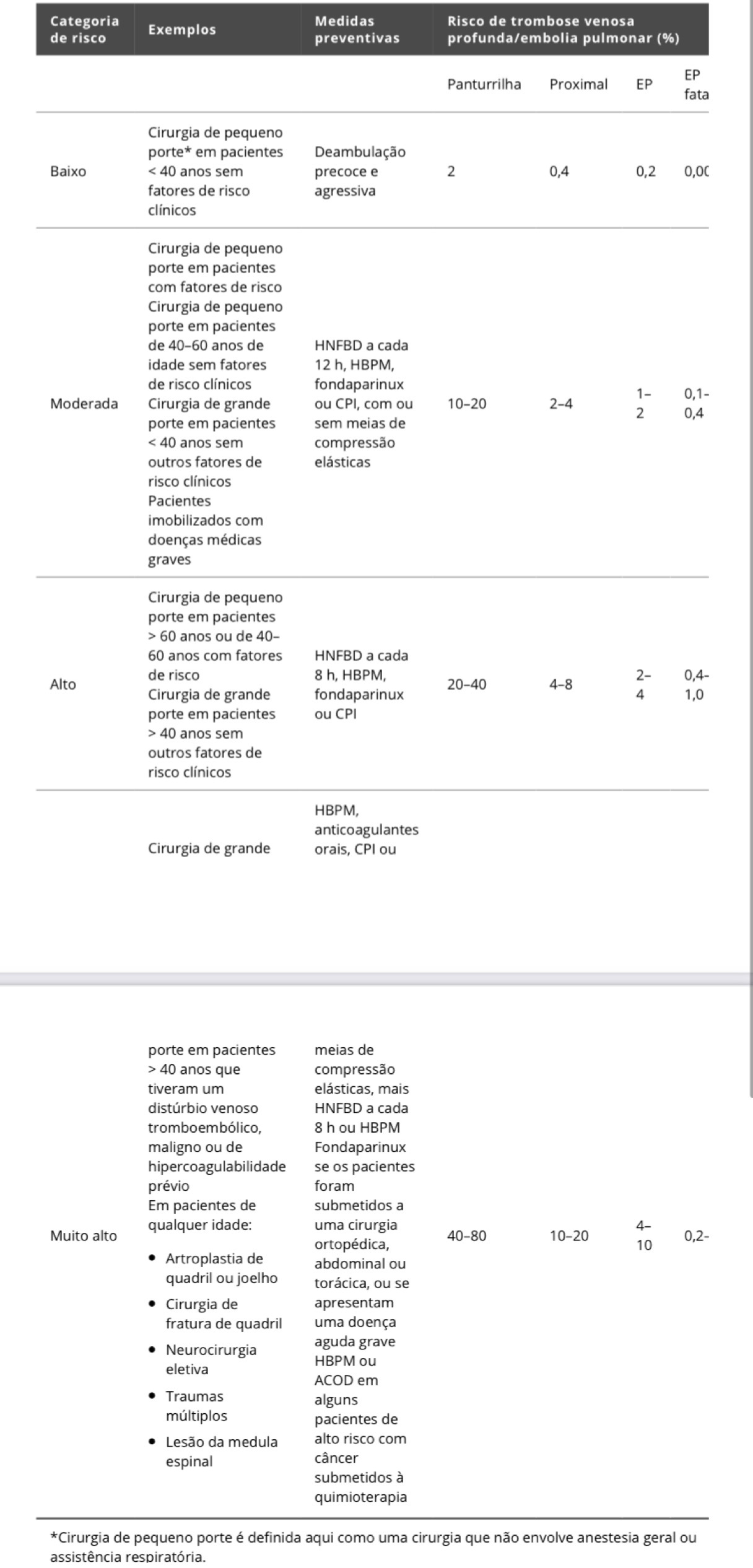 HBPM (Enoxaparina) - 40 mg SC (se paciente > 100 kg - 60 mg SC) - não fazer se TFG < 30 (ou faz dose de 30 mg SC)