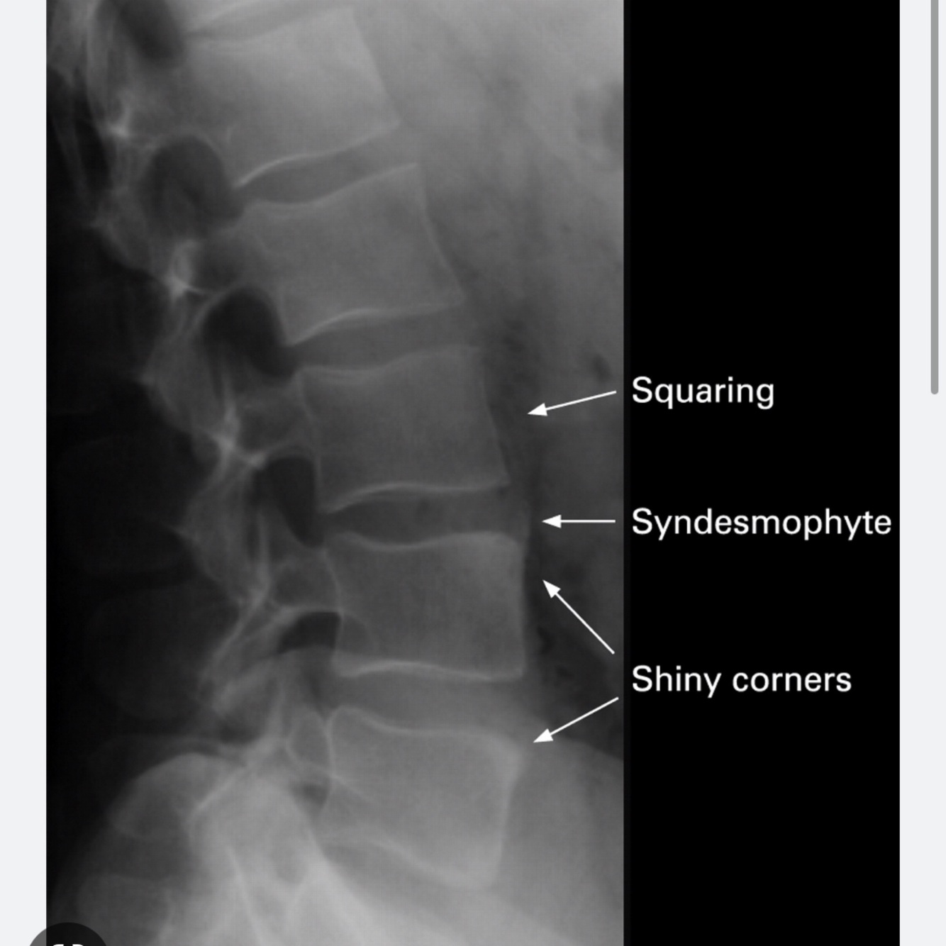 -Shiny corners: The shiny corner sign is a spinal finding in ankylosing spondylitis, representing reactive sclerosis secondary to inflammatory erosions at the superior and inferior endplates