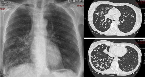 The HRCT you can see the black holes and I think it shows the dilated bronchioles that happens because of recurrant infections and destruction of the elastin and the muscular components