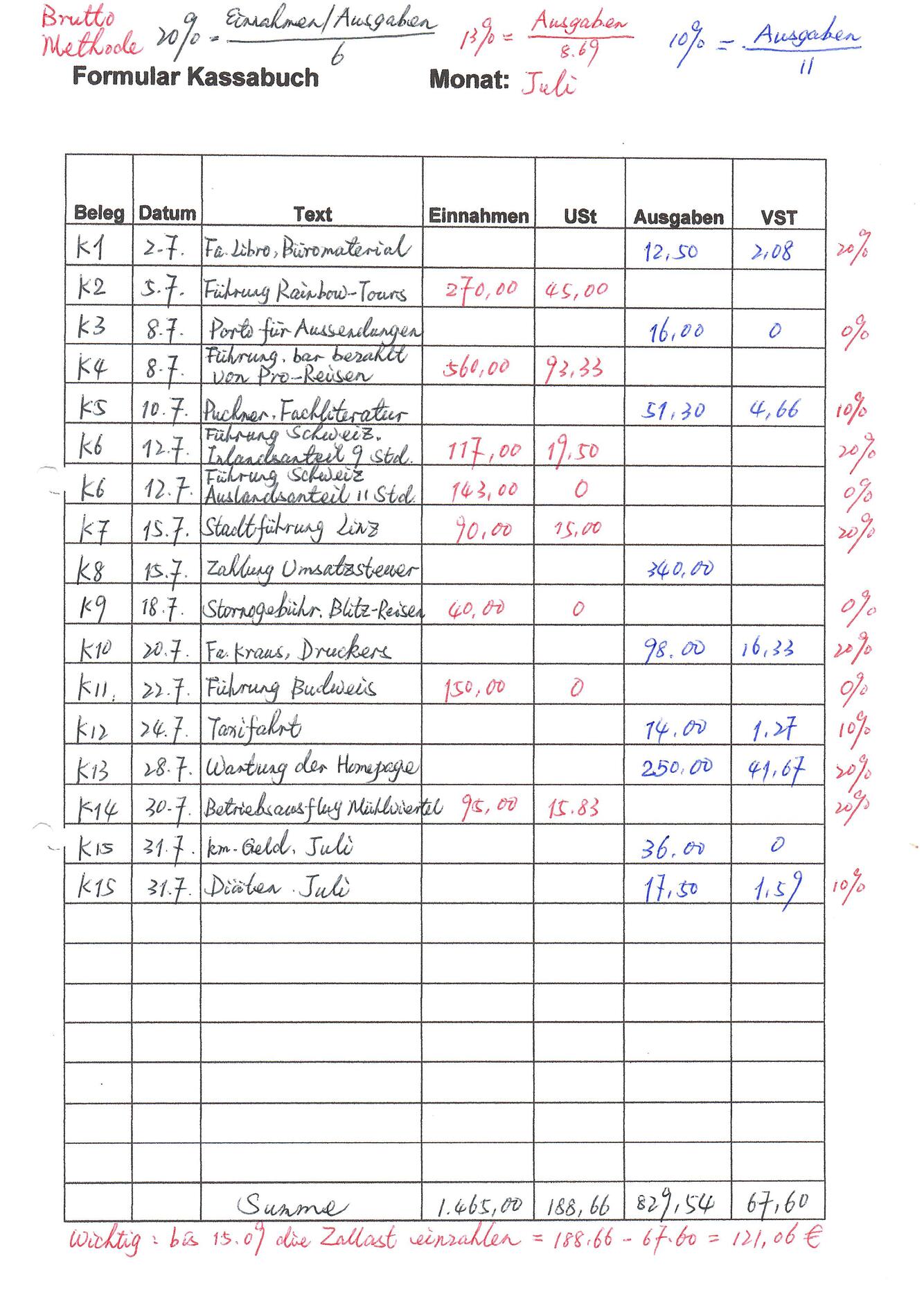 Kassabuch- Bruttomethode mit Beilage 1