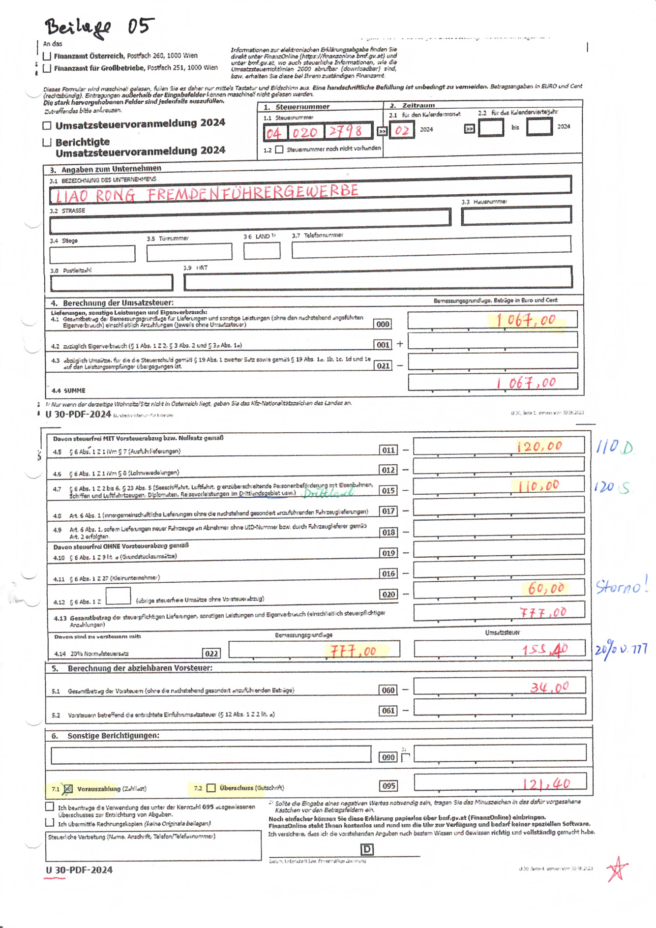 Umsatzsteuervoranmeldung mit Beilage