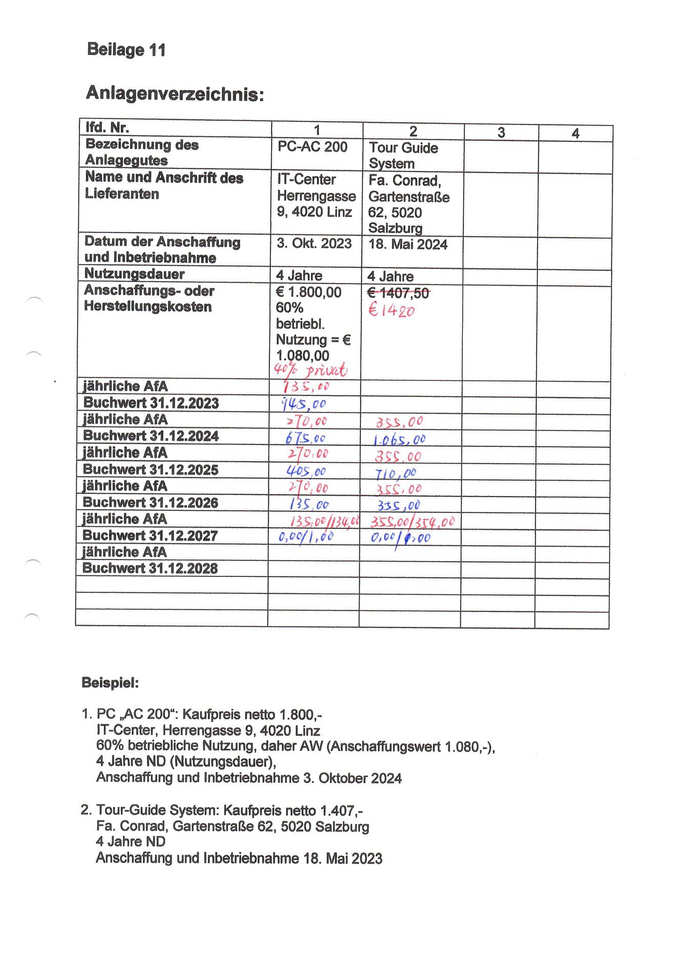 Anlagenverzeichnis mit Beilage