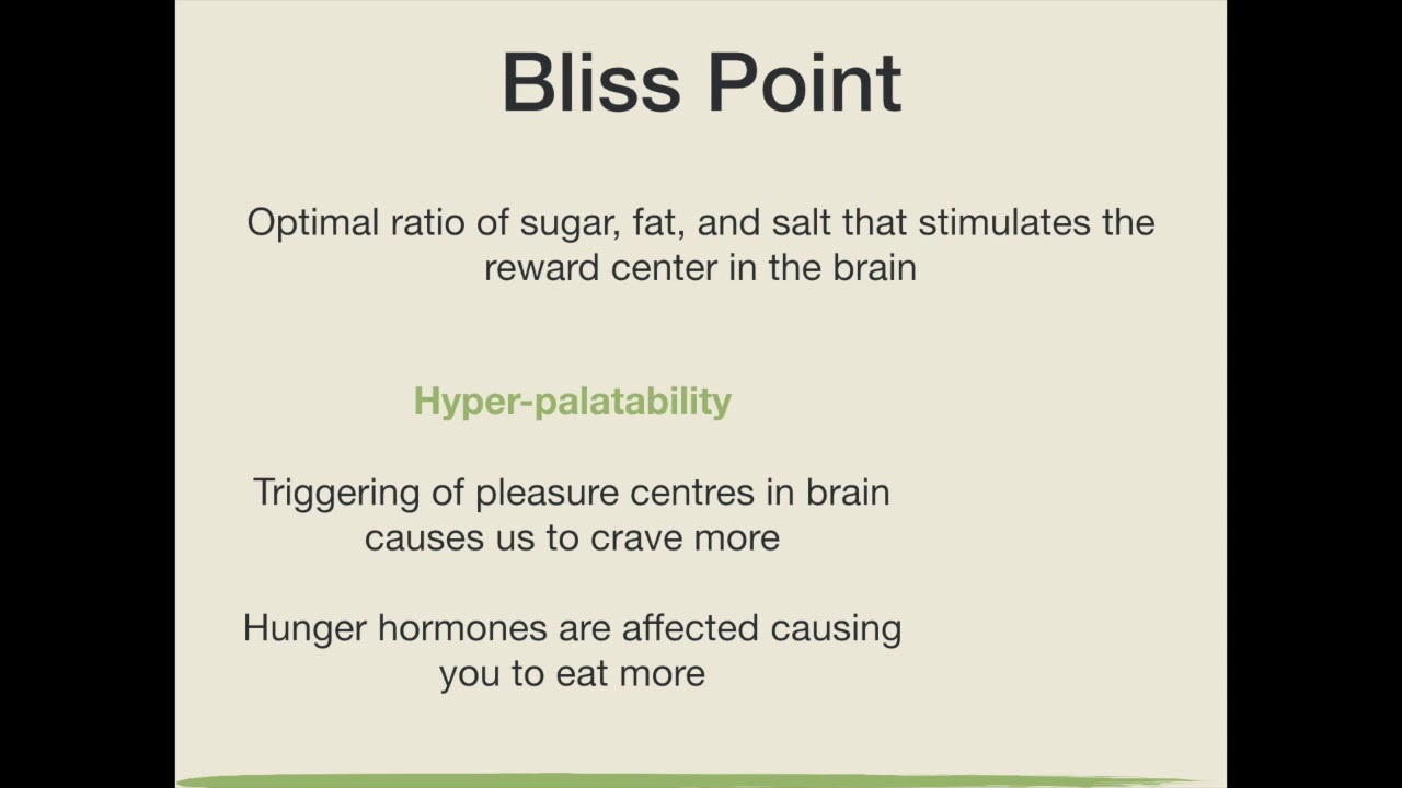 The food industry goes to great lengths to figure out what makes us crave a product. The exact combination of ingredients it calls the “bliss point”. Source: The Secrets of Sugar. CBC documantary