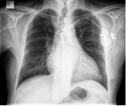 Where is the indicated lead located (pointing the thin lead with the white dots crossing to the left side of the heart)