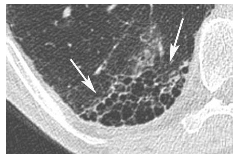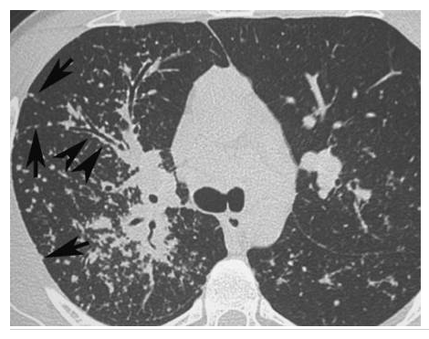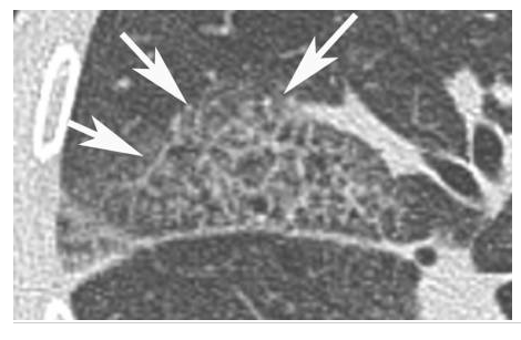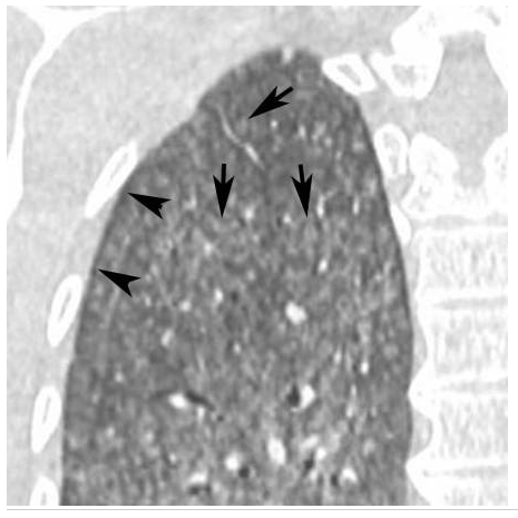 Agrandissement sur le sommet droit d’une coupe frontale. Micronodules à limites floues (flèches) de distribution diffuse dans les deux poumons. Leur topographie centrolobulaire est attestée par l’absence de micronodules sous-pleuraux (têtes de flèches).