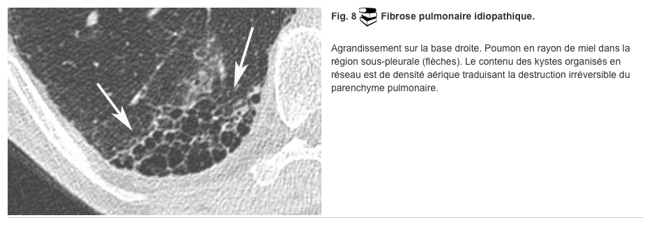 réticulations intralobulaires et rayon de miel dominant de topographie basale et corticale dans la fibrose pulmonaire idiopathique ;