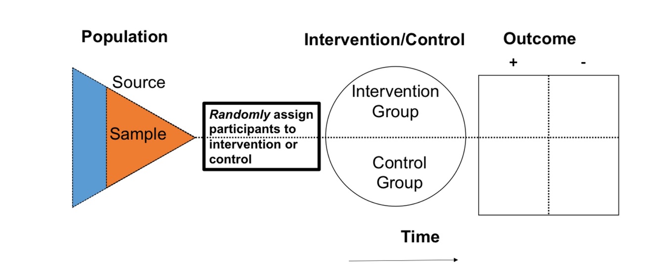 Randomly assign exposure, then follow-up to find out outcome(s)