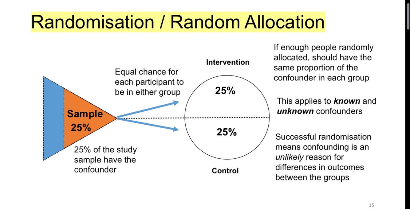 Randomisation (if done well) maximises the likelihood that potential confounders are evenly distributed between groups