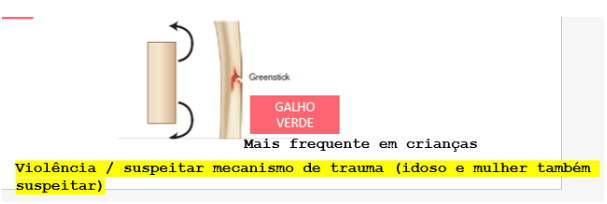 Fraturas em galho verde (encurvamento do córtex ósseo com rachaduras em apenas 1 lado do córtex) são fraturas da infância.