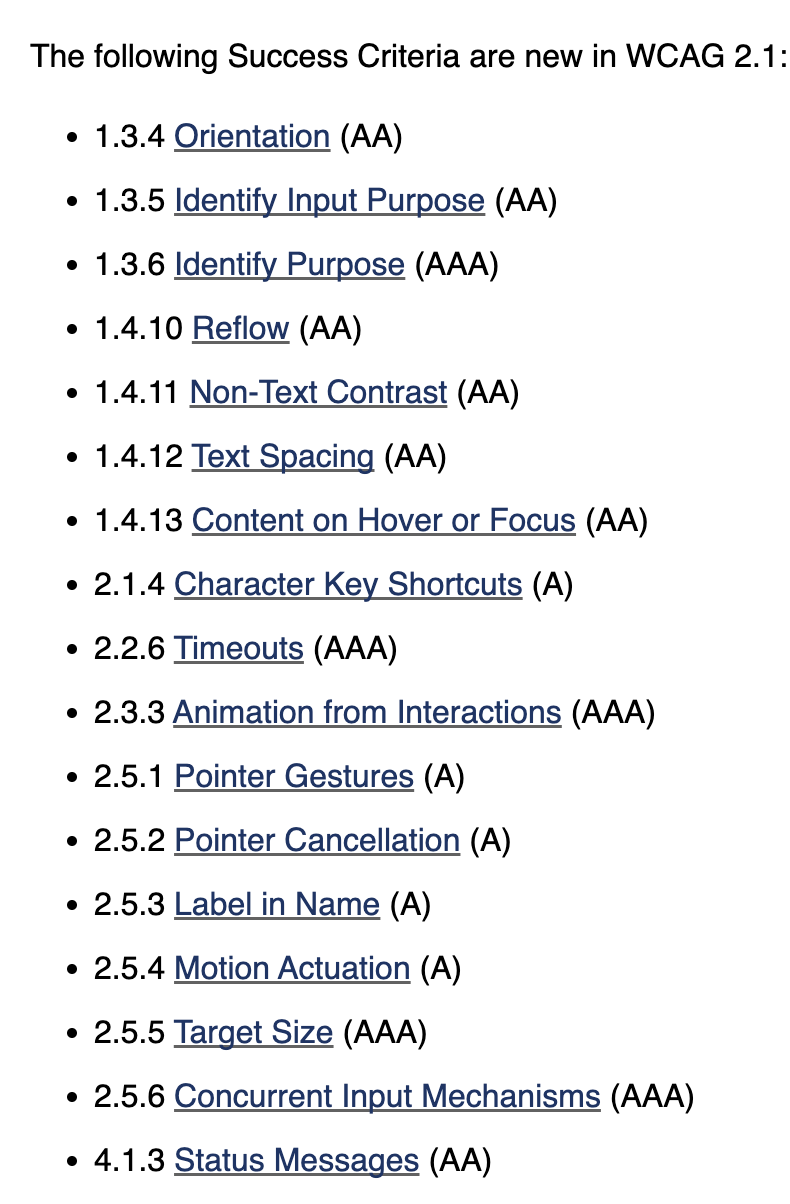 What are all the “Perceivable” Level AA criterion for 2.1?