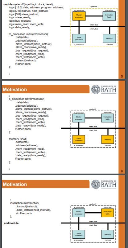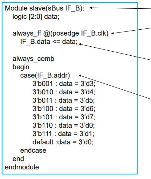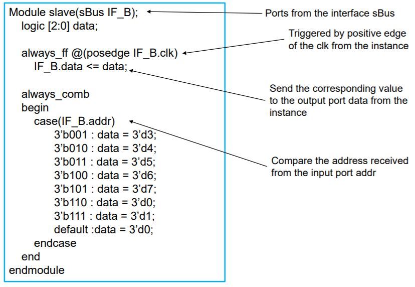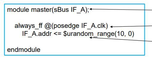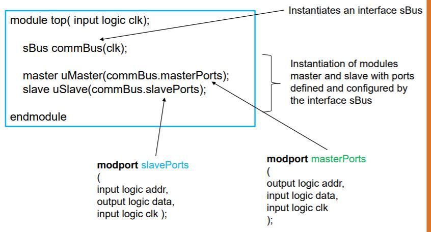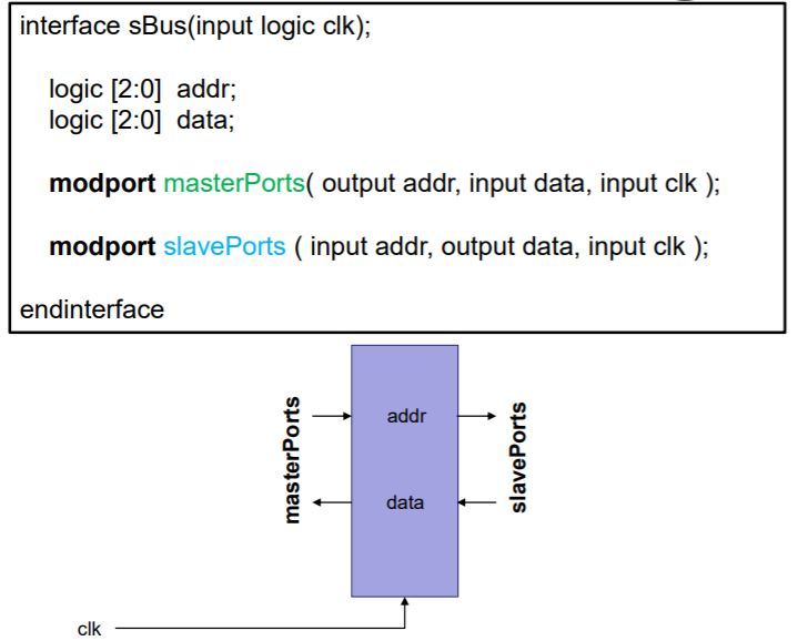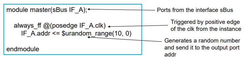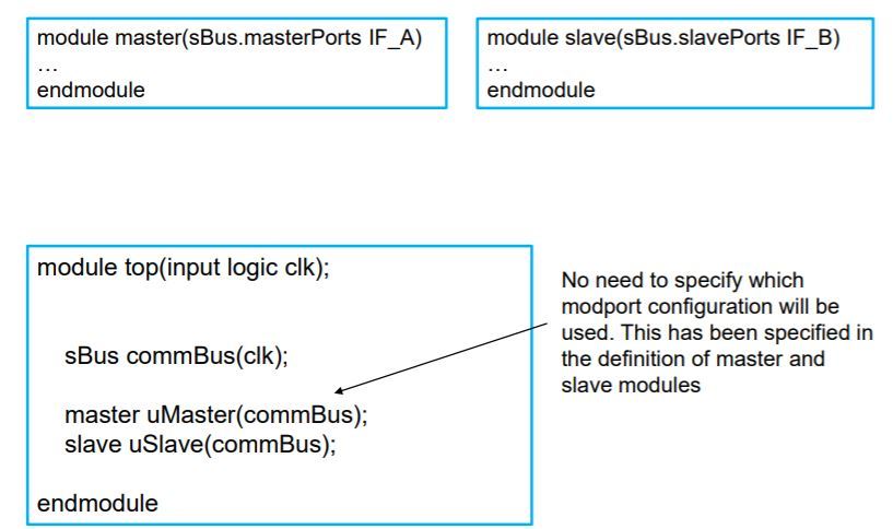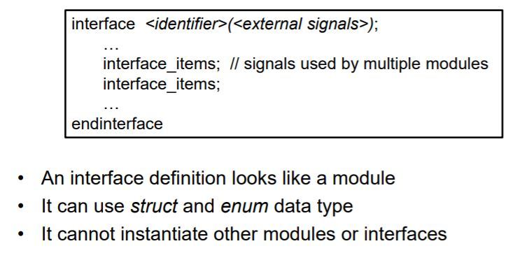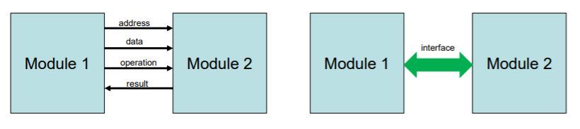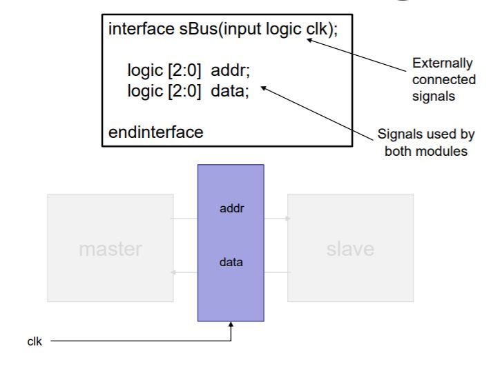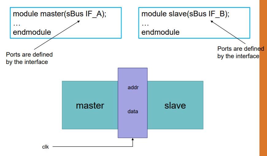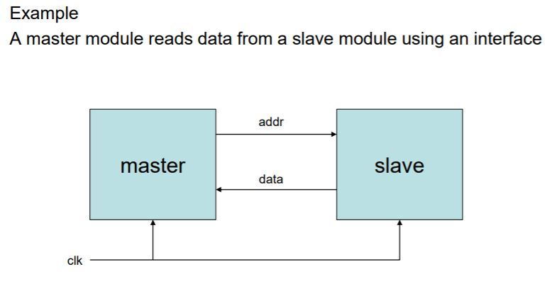 It is easy to end up with systems in which many signals are passed between two blocks. SystemVerilog provides an Interface construct, which offers a new paradigm for modelling large and complex design. The interface construct allows signals to be collected together even though they are moving in different directions