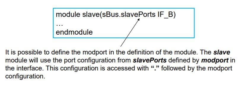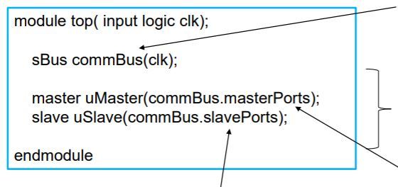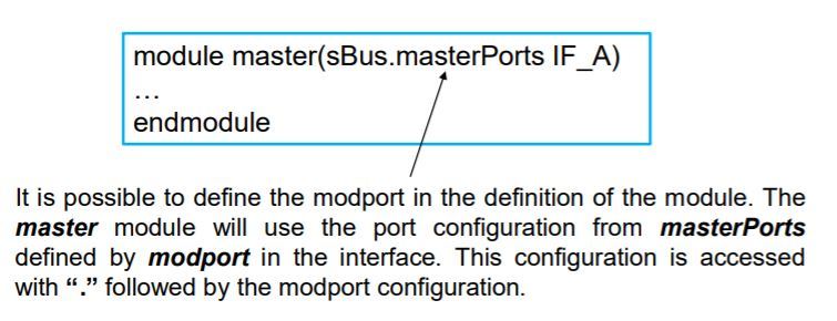 It is possible to define the modport in the definition of the module. The master module will use the port configuration from masterPorts defined by modport in the interface. This configuration is accessed with “.” followed by the modport configuration.