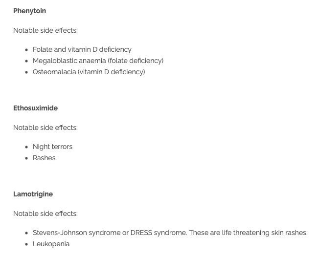 What are the side effects for phenytoin, ethosuximide and lamotrigine?