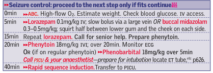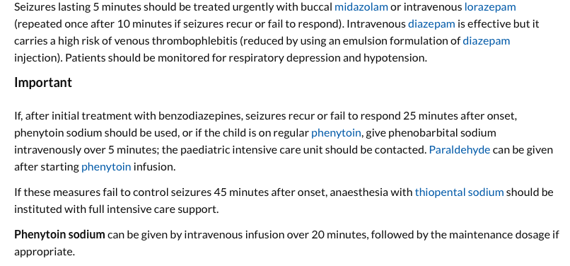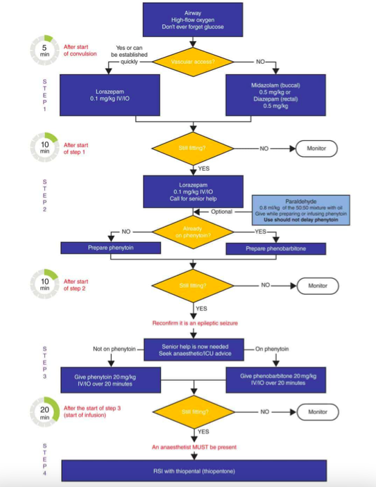 How is status epilepticus in children managed? (seizure >5 minutes or 2 or more seizures without regaining consciousness)
