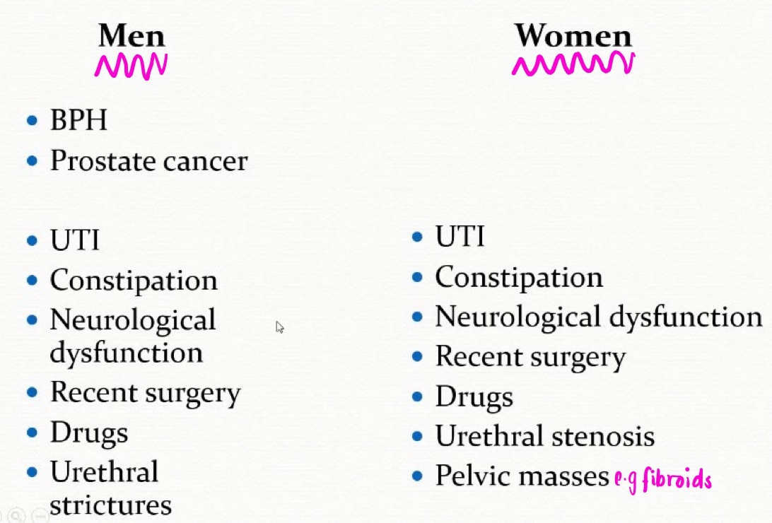 What are some causes of urinary retention in men and women?
