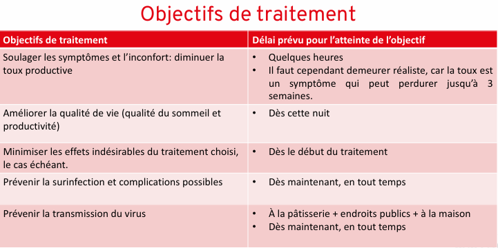 présence d’une toux productive car l’expectoration est souhaitée pour