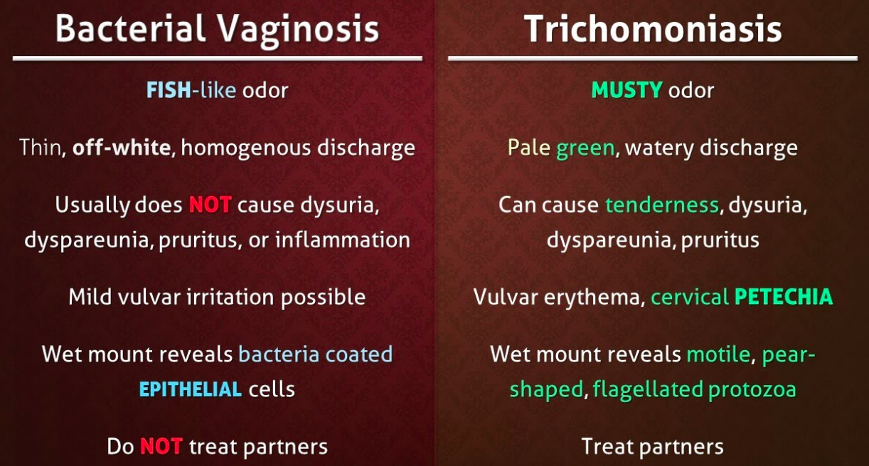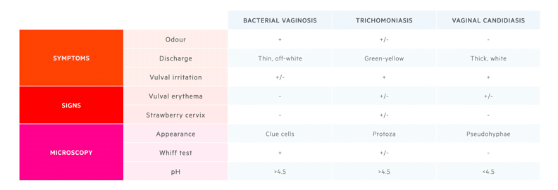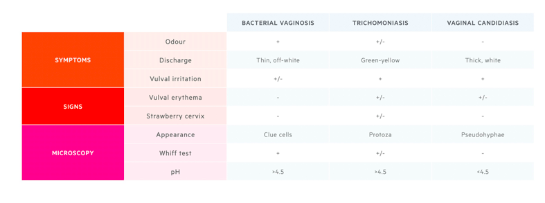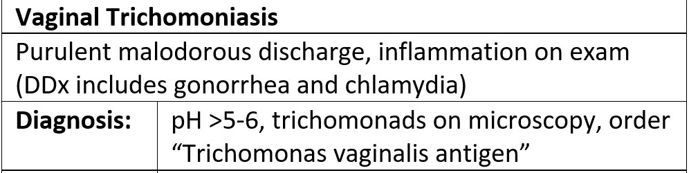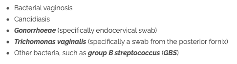 Ix: Speculum, Lateral wall pH, high vaginal charcoal swab, STI screening