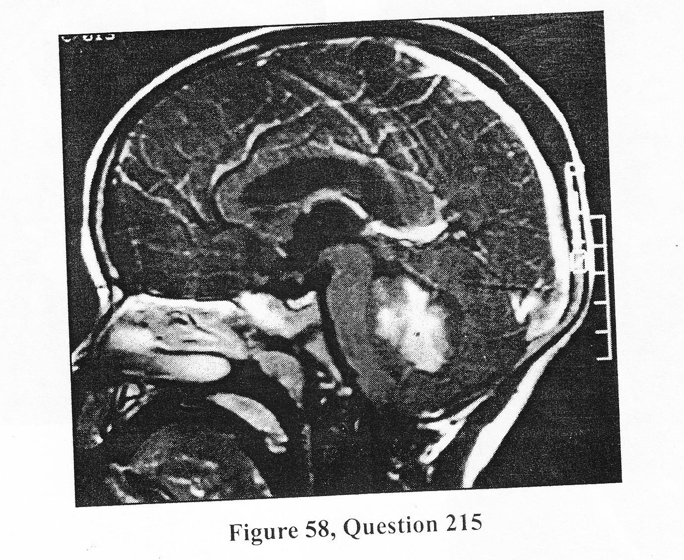 A 5-year-old boy presented with a 3-week history of progressive headache, nausea, vomiting, and blurred vision. On neurologic exam, he had bilateral abducens (CN VI) palsies, papilledema, and mild ataxia. Figure 58 depicts images from an MRI study. 215. Based on the patient’s history, physical, and MR findings, what is the MOST LIKELY diagnosis?