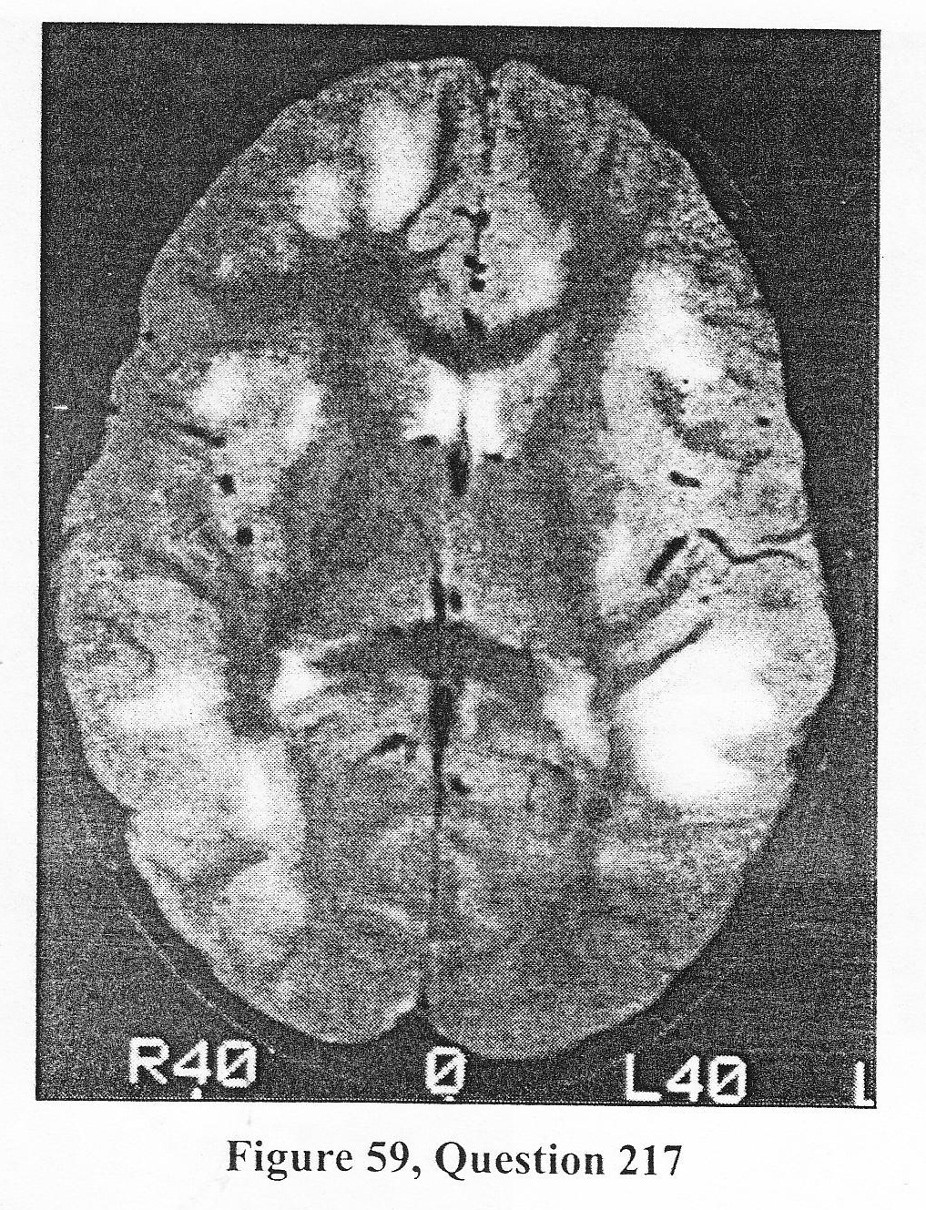 A 25-year-old woman presented to the emergency room with the new onset of seizures. An MR! of the head was obtained. Representative scans with Tl and T2 weighted images are depicted in Figures 63 and 64.
