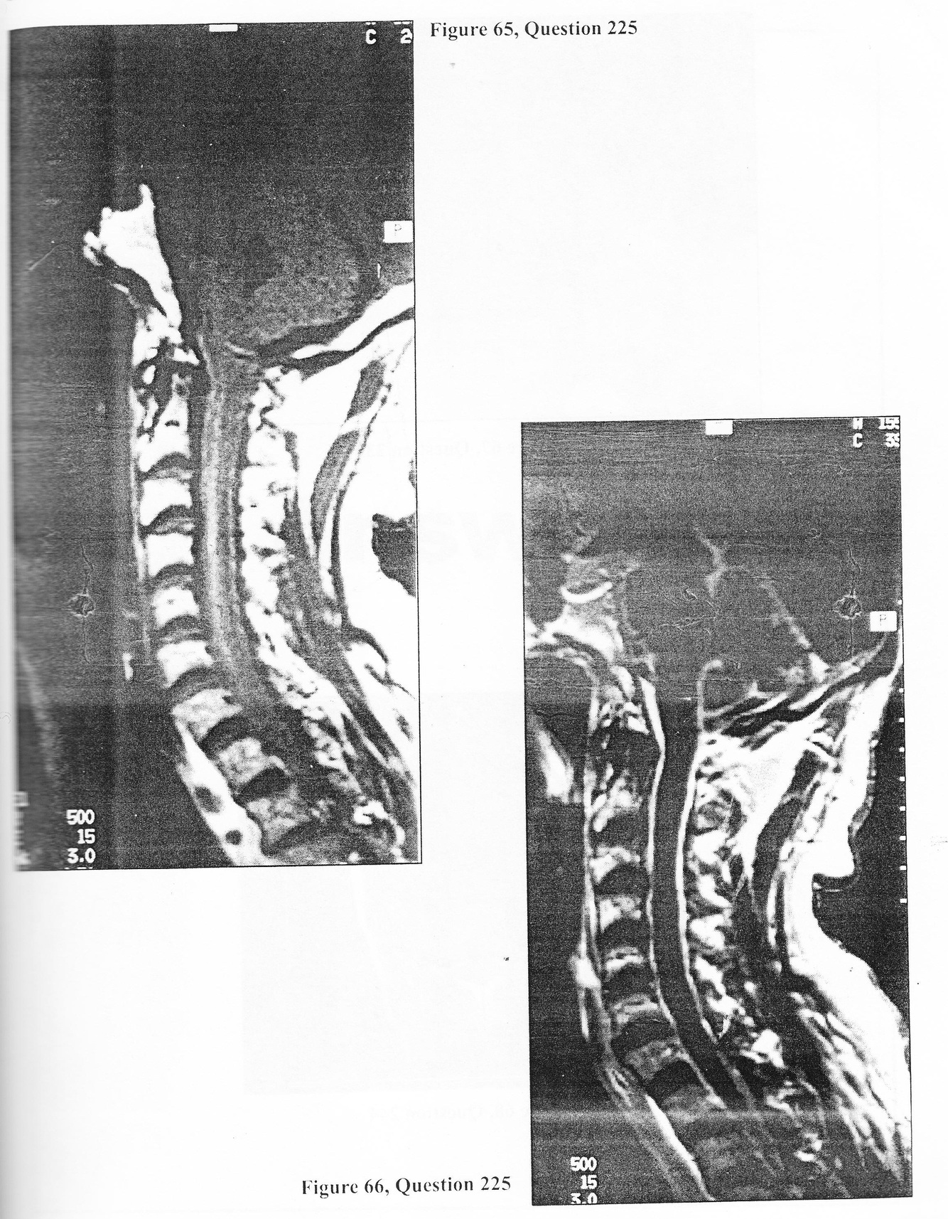 A 64-year-old Native American presents to a regional medical center in the southwestern United States with the progressive onset of fever, stiff neck, and quadriparesis. Unenhanced and enhanced Tl-weighted MRI images are represented by Figures 65 and 66.