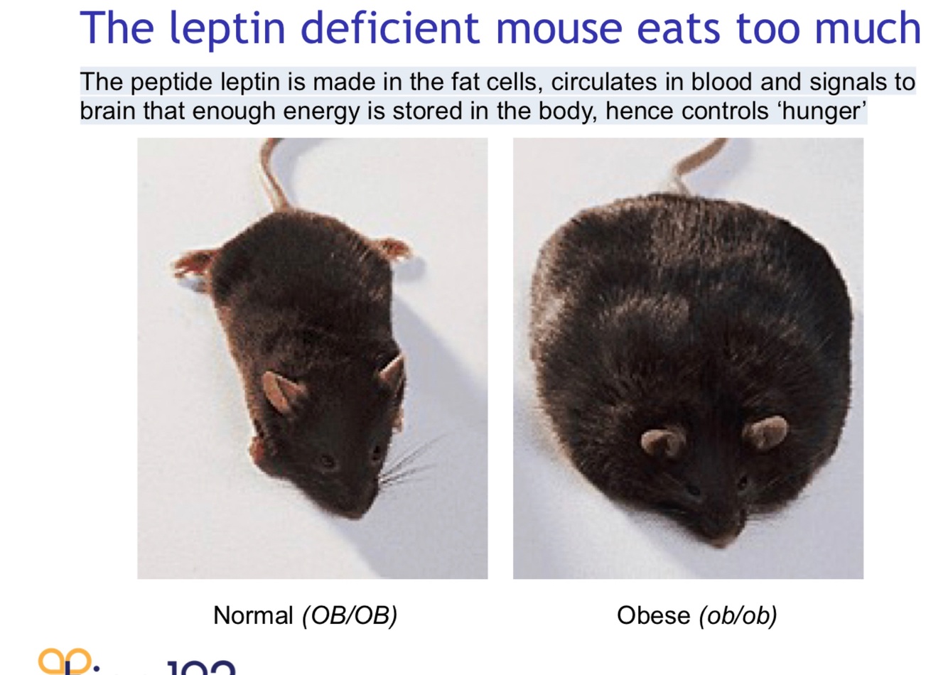 The peptide leptin is made in the fat cells, circulates in blood and signals to brain that enough energy is stored in the body, hence controls ‘hunger’