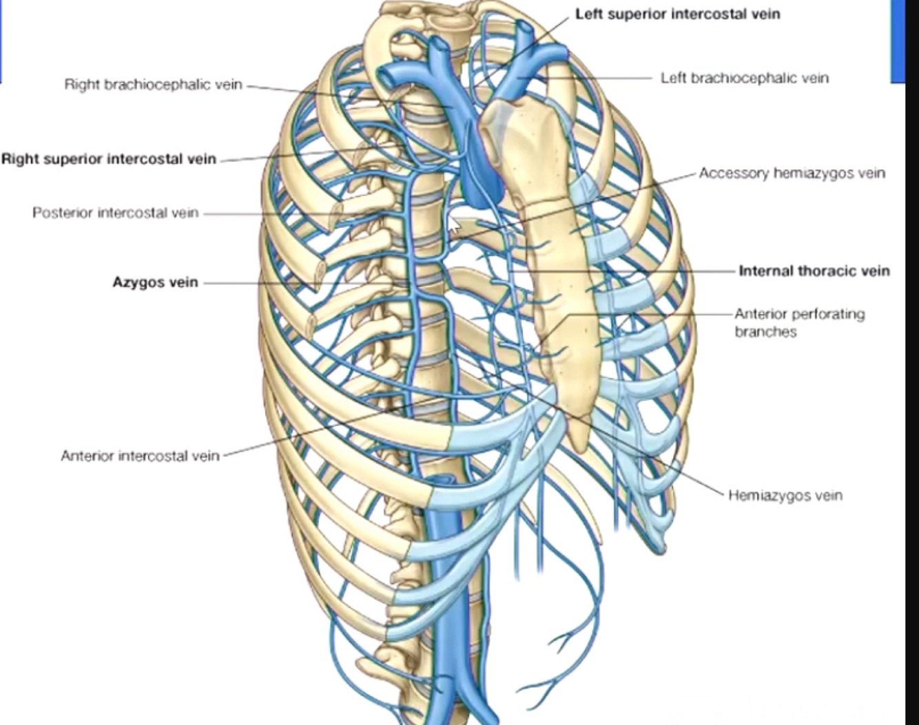 Anterior intercostal vein —> internal thoracic vein —> brachiocephalic vein