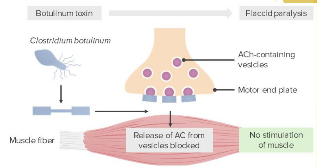 No botulismo, o bloqueio que ocorre é na liberação de acetilcolina nas junções neuromusculares, resultando em paralisia flácida.