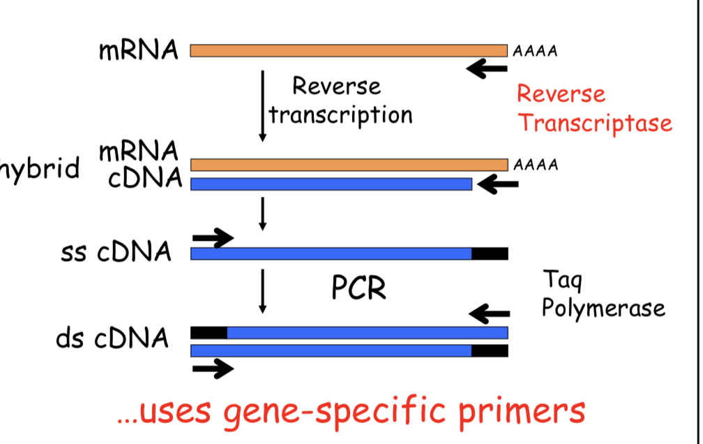 it uses a polymerase that uses RNA as a template. then uses cDNA to make double strnads of DNA with taq polymerase. uses gene specifc primers
