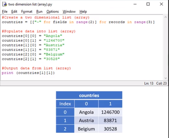 You can visualise a two dimensional array as looking like a table with two sets of indexes. One index for the rows, another for the columns.