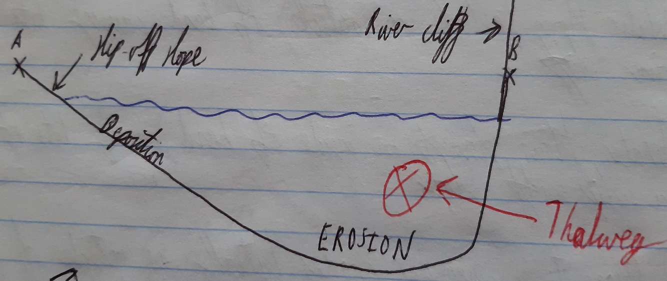 -meander erodes laterally (outside of bend undercuts river cliff), causes collapse and retreat, meander gets bigger