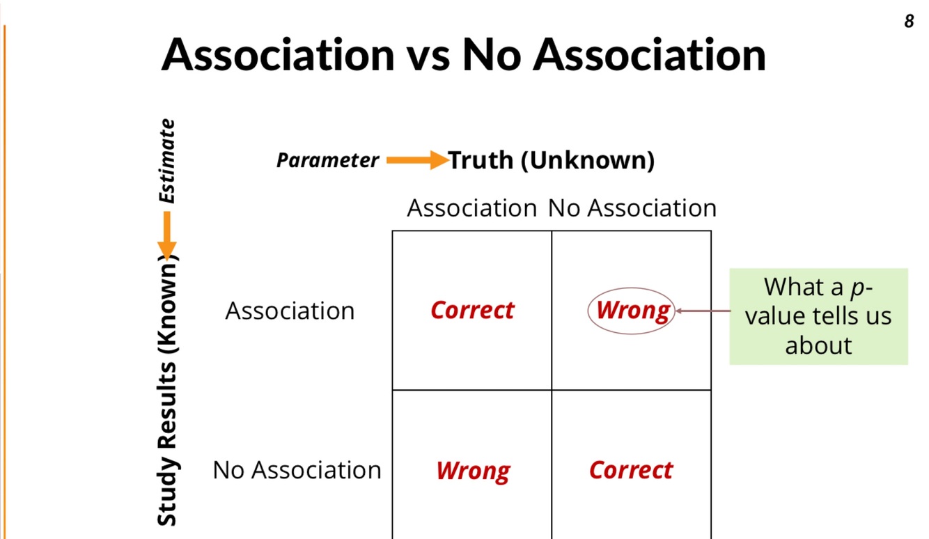 Probability of getting study estimate (or one further from the null), when there is really no association, just because of sampling error (chance)