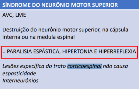 Lesões em neurônios motores superiores causam um período inicial breve de paralisia flácida seguida de hipertonia e hiper-reflexiva (paralisia espástica).