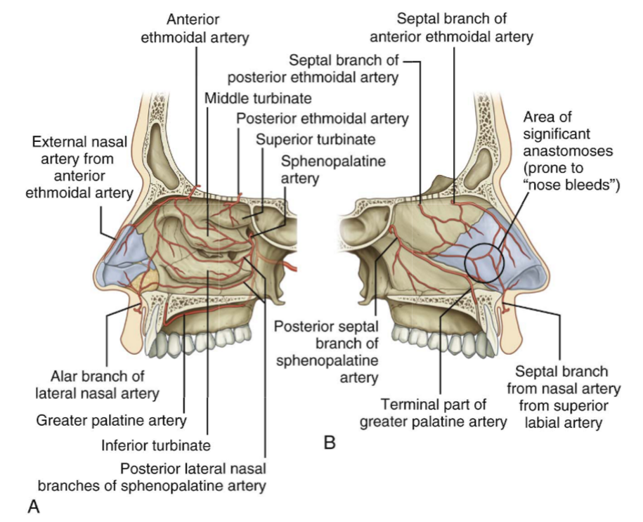 The majority of bleeds (90% to 95%) originate anteriorly; many of the anterior bleeds occur in Little’s area within Kiesselbach’s plexus. Occurring much more often than posterior bleeds because of their location (nose picking/local trauma, dryness), anterior bleeds are easily accessible and managed with conservative measures such as moisturization, pressure, decongestion, or topical cautery. Posterior bleeds are generally from the distribution of the sphenopalatine artery. The exact focus of origin is more challenging to identify, and these bleeds are therefore more likely to require nasal packing as part of intervention.