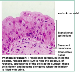 When bladder is empty looks cuboidal when full looks squamous