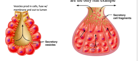 Merocrine: products are secreted by exocytosis (pancrease, sweat, salivary)