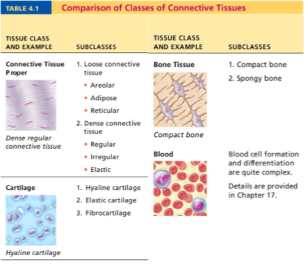 Main classes: connective tissue proper, cartilage, bone, blood