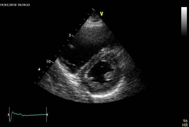 shown is of a focused transthoracic echocardiogram, parasternal short axis view.