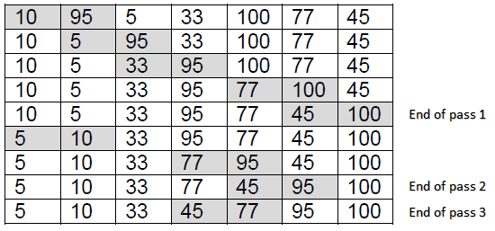 Show the steps of a bubble sort on the following array - clearly label the passes.