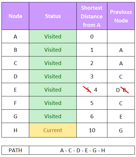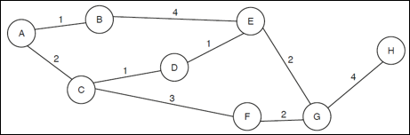 Perform Dijkstra’s on the following graph to find the shortest path between A and H