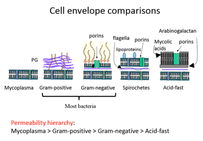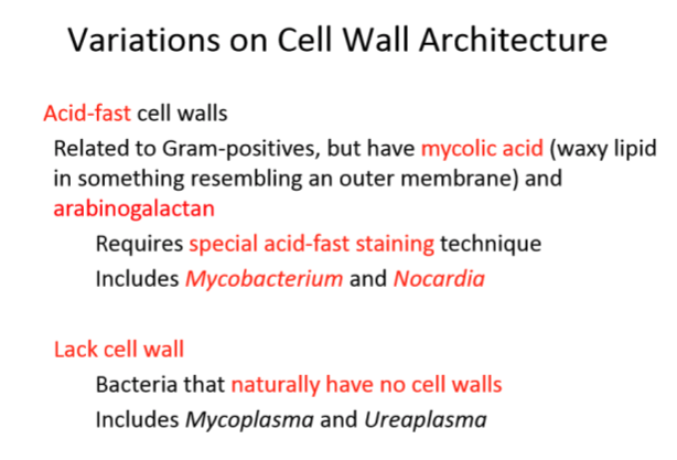 Describe the acid-fast and lacking cell wall features of some bacteria.