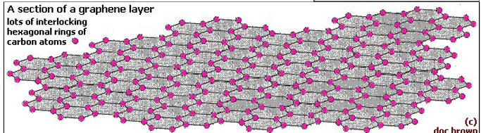 Graphene is pure carbon in the form of a very thin sheet (2D) one atom thick. Carbon atoms are bonded in the same was as in graphite. Sheets are formed of hexagonal carbon rings very strong rigid material very lightweight. Has delocalised electrons move through each layer allowing it to conduct electricity